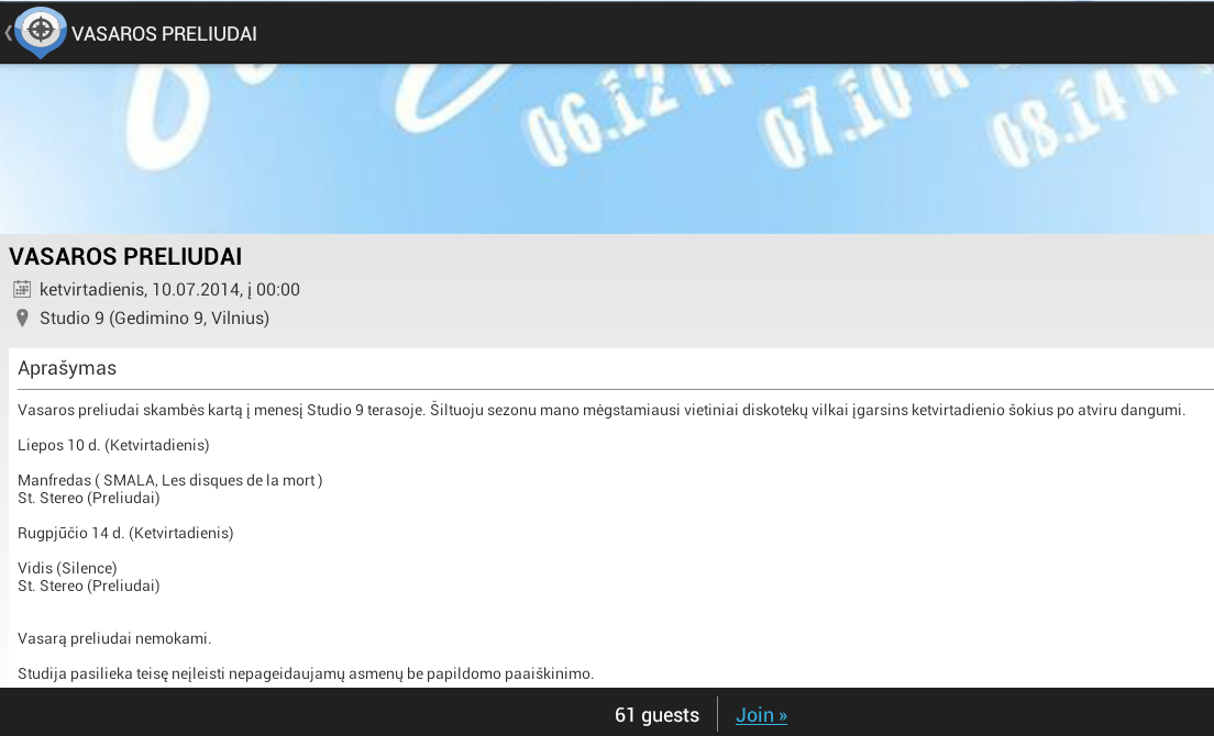 Renginių informacija buvo imama iš facebook events ir pagal API kaupiama duomenų bazėje ir atvaizduojama programėlėje.