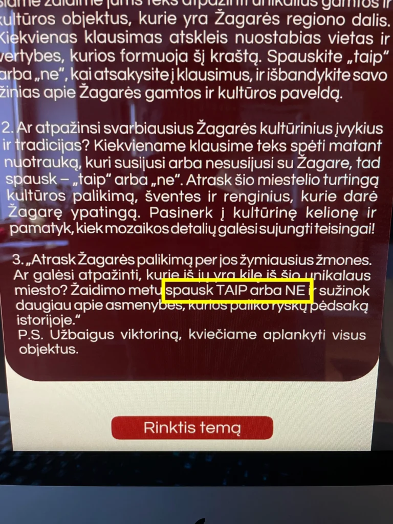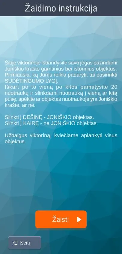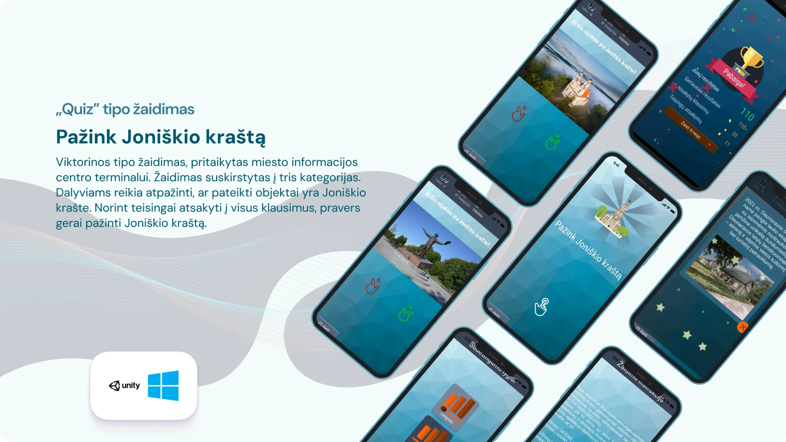 Mobilieji žaidimaiViktorinos tipo žaidimas, pritaikytas miesto informacijos centro terminalui. Žaidimas suskirstytas į tris kategorijas. Dalyviams reikia atpažinti, ar pateikti objektai yra Joniškio krašte. Norint teisingai atsakyti į visus klausimus, pravers gerai pažinti Joniškio kraštą.